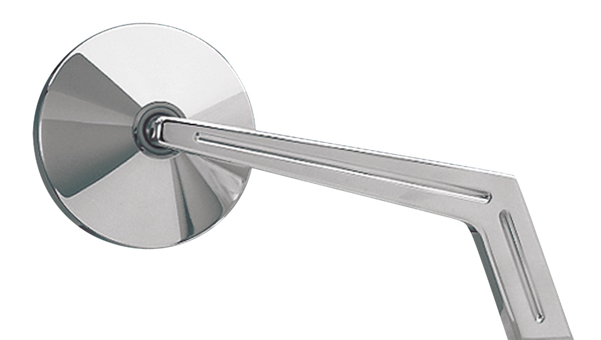 Specchietto liscio tondo e stelo ad angolo scanalato. Diametro 3 1/16″ (7,8cm), lunghezza stelo 6 1/2″ (16,5cm).